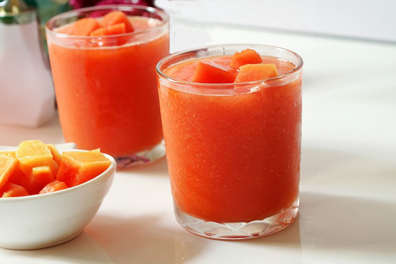 Remove the skin from the papaya, cut it in half, and scoop out the seeds. Chop the papaya into chunks blend adding pineapple juice.